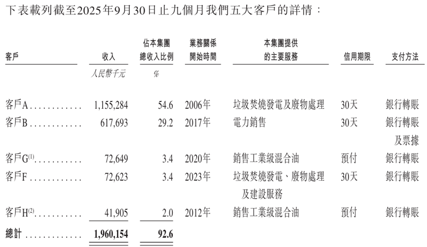 同期,来自公司最大客户的销售分别为8.40亿元、7.79亿元、8.19亿元及11.55亿元,分别占公司同年总收入的54.3%、42.4%、34.0%及54.6%。军信股份最大的客户为位于湖南省长沙市的市政府机构。