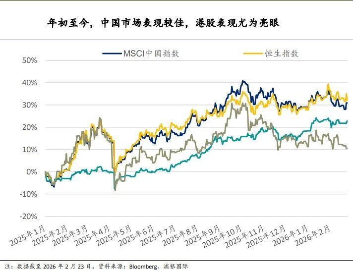 从仓位的配置上来看,尽管目前全球投资人对中国股票市场的风险敞口仍然处在低配的水平,更多是一些结构上的调整,但未来增配的潜力很大。在国际地缘政治动荡的背景下,中国资产的韧性会持续凸显。今年开年以来,前期亚太市场和新兴市场受益于存储和芯片的超级周期大幅上涨,相对而言,目前中国市场估值合理,有更好的增长潜力。