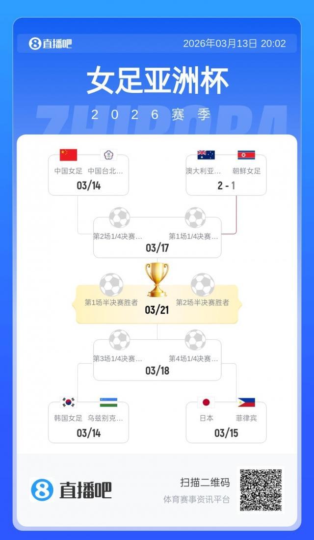 直播吧03月13日讯 女足亚洲杯1/4决赛,澳大利亚女足2-1战胜朝鲜女足,率先晋级四强,接下来将面对中国女足与中国台北女足的胜者。