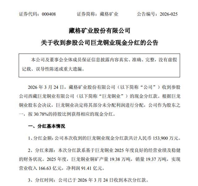 3月25日,藏格矿业(000408.SZ)公告称,公司于3月24日收到参股公司西藏巨龙铜业有限公司现金分红款15.39亿元。该分红基于巨龙铜业2025年度实现营收166.63亿元、净利润91.41亿元的良好业绩,公司按30.78%持股比例获得分红。此次分红将增强公司现金流,对经营及投资提供资金支持,并对未来业绩产生积极影响。具体会计处理以年度审计结果为准。