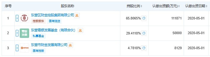 东营区财金投资发展有限责任公司成立于2014年,东营区财金控股集团有限公司、东营青银发展基金(有限合伙)、东营市财金发展有限公司分别持股约65.81%、29.41%、4.78%。