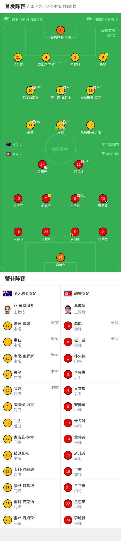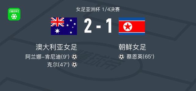 北京时间3月13日女足亚洲杯 1/4决赛,澳大利亚女足对阵朝鲜女足。澳大利亚女足阿兰娜-肯尼迪破门,克尔破门。朝鲜女足蔡恩英破门。最终比分澳大利亚女足 2-1 朝鲜女足。